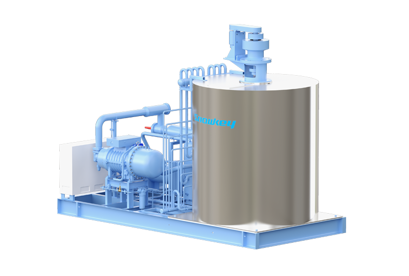 片冰呈现为不规则鳞片形,长、宽分别为10 mm~50 mm,厚度1.0 mm~2.2 mm,干燥洁净、不易成团。与板冰、管冰等冰形相比,相同质量的片冰拥有更大的表面积,可轻松进入被冷却物间隙之间并与它们充分接触带走热量,因此适用于急速冷却。此外,片冰厚度均匀,无尖锐棱角,如用在食物保鲜则不易损伤食材外观,并能有效延长食材保鲜时间。目前,片冰机产品可广泛应用于渔业保鲜、水产及肉类加工、化工反应釜降温、建筑混凝土降温及人造雪工程等。