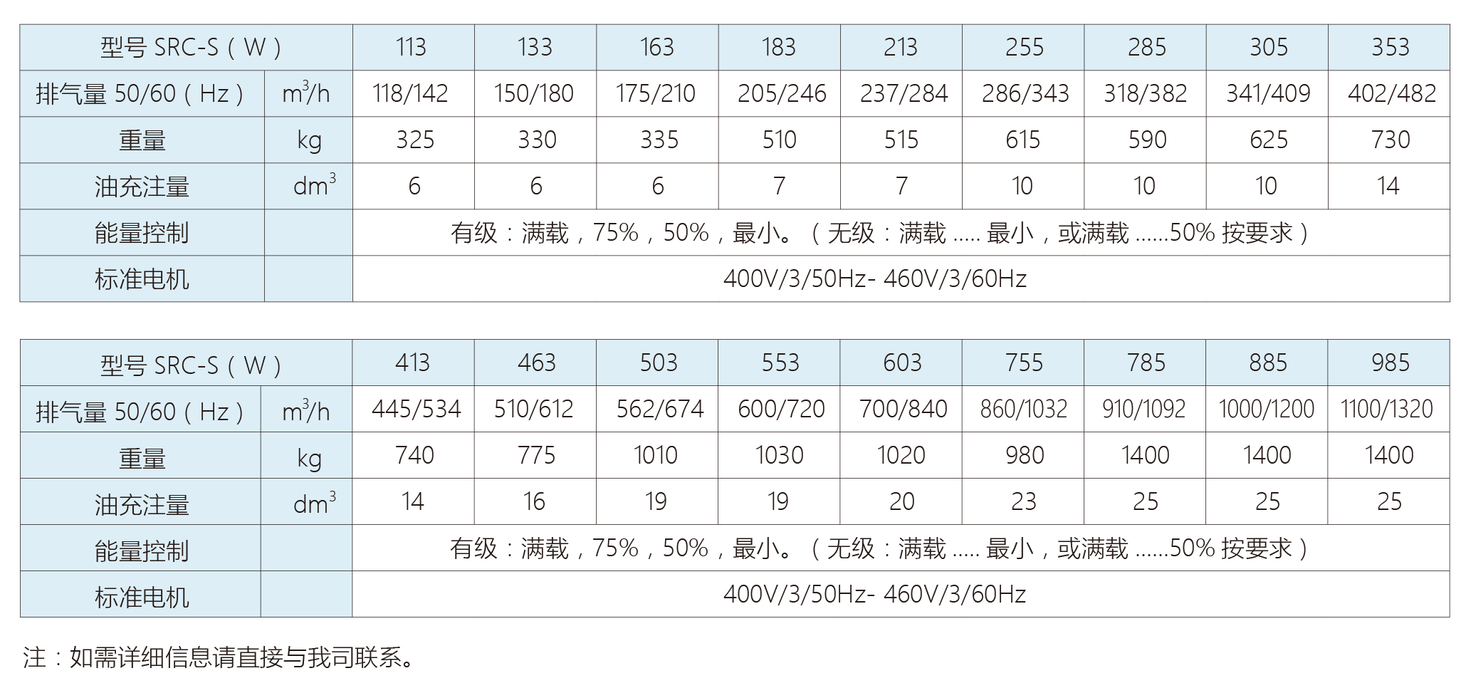 雪人RefComp SRC-S系列半封闭螺杆压缩机为紧凑型设计压缩机,其排气量型谱完整,广泛应用于特种空调及冷冻领域,工艺冷水及爆炸性气体环境等,针对满液式、常温热泵及冷水机组等不同应用,均有相应配置。RefComp SRC-S系列半封闭螺杆压缩机适用于R22、R404a、R507A等制冷剂,排气量范围118~1100m3/h(2960rpm),额定功率范围40~390Hp,共计18种型号。